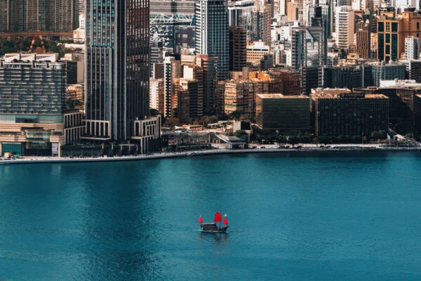 A red sail junk boat passes by a never-ending horizon of concrete skyscrapers along Victoria Harbour, Hong Kong. © Derry Ainsworth