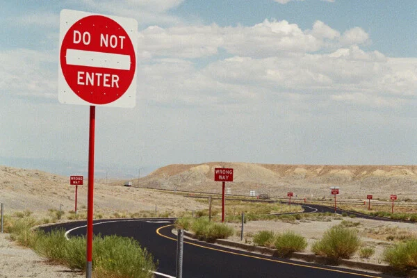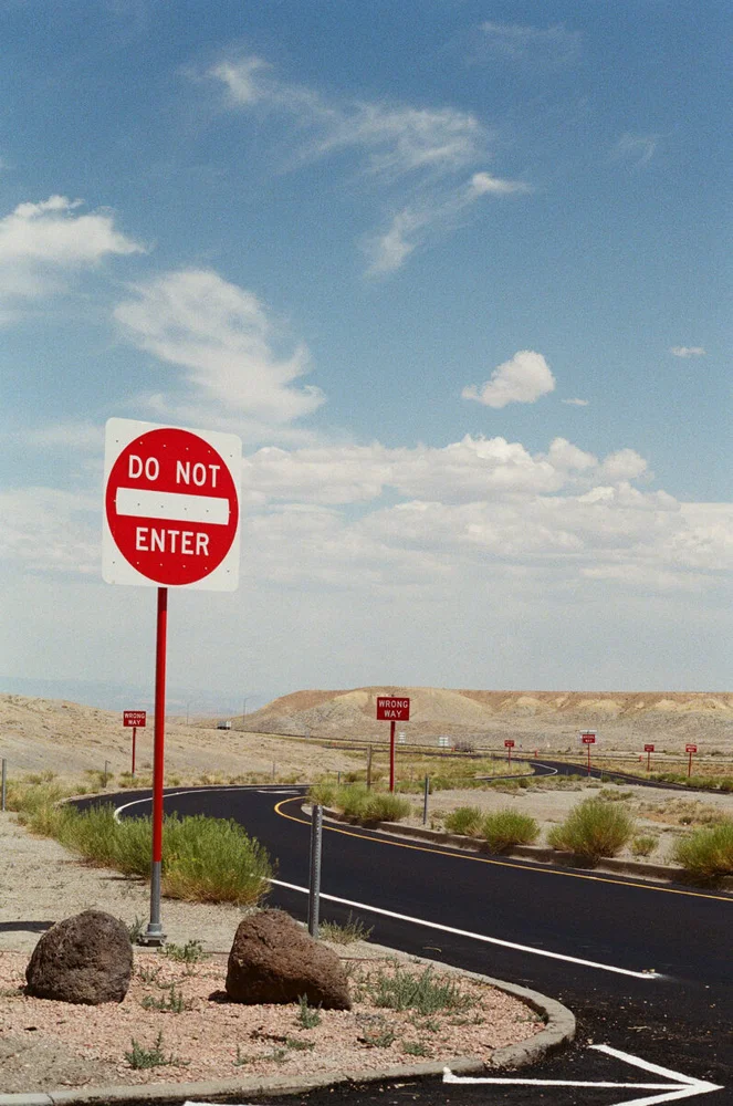 Shot on 35mm film on my aunt’s Canon A1 at a rest stop somewhere in an arid, dry environment. I was called to the repetitive nature of the signs along the deep winding curve, hosting a beautiful collection of colors. A composition begging to be captured. Somewhere in the United States Cross cross-country road trip 2025. © Jacq Jacqueline