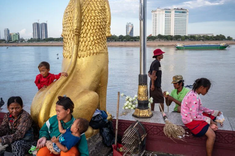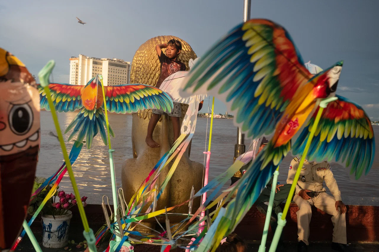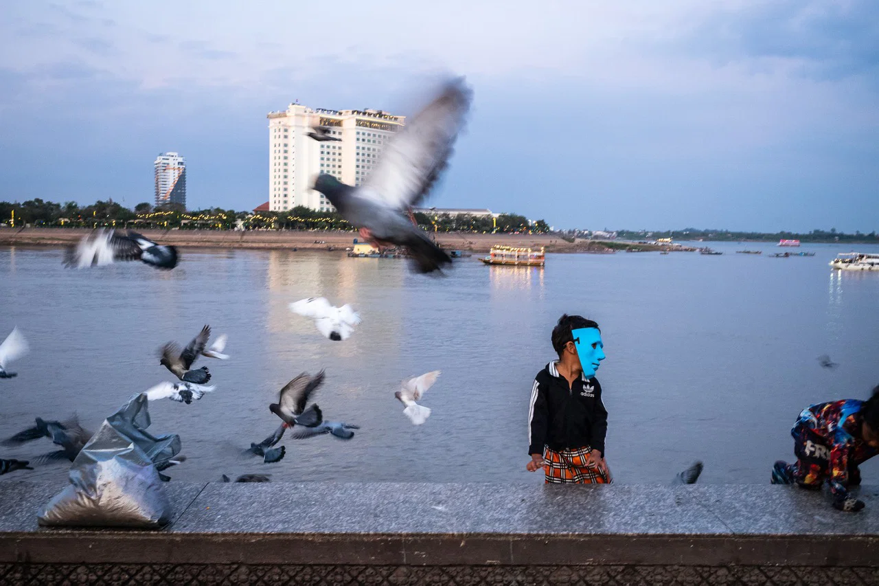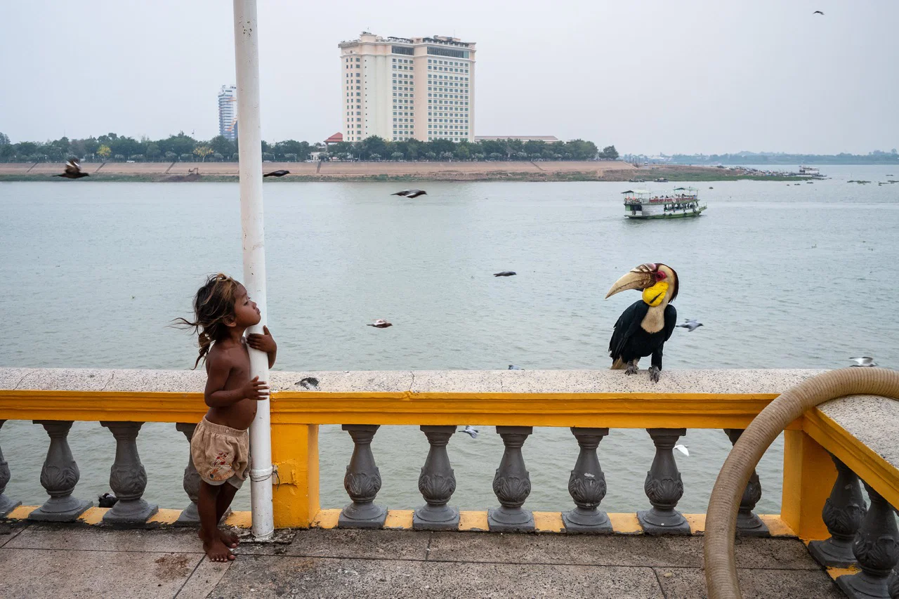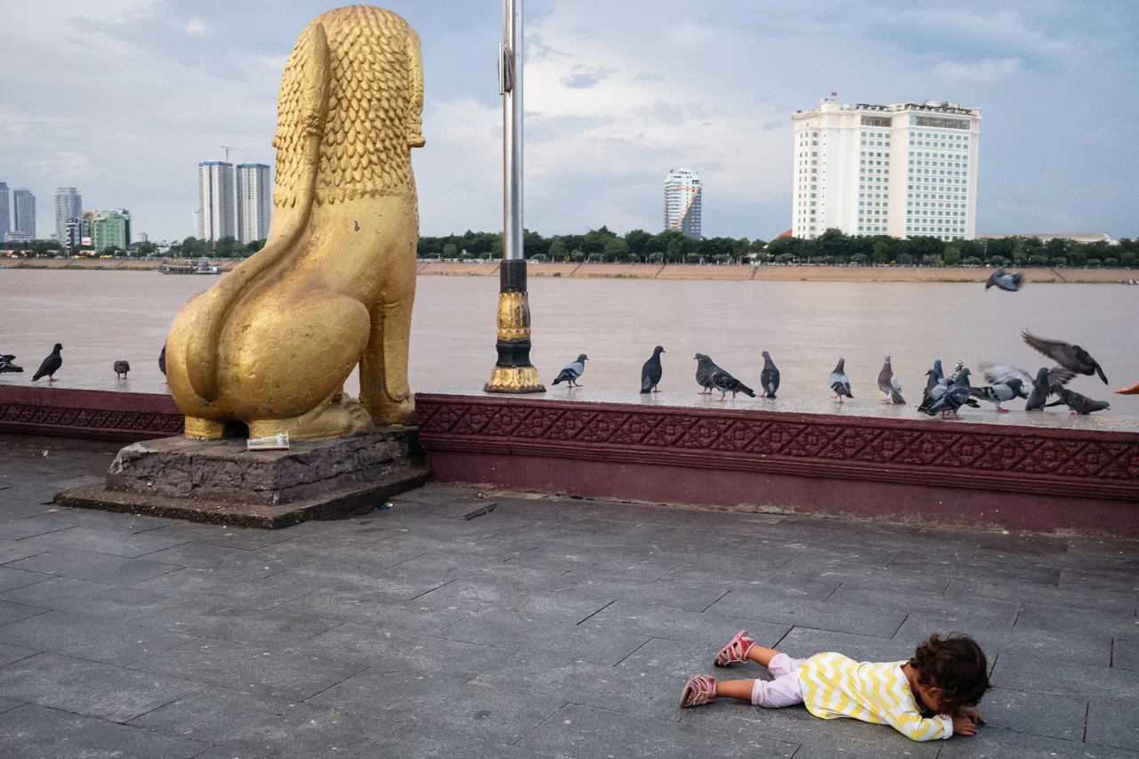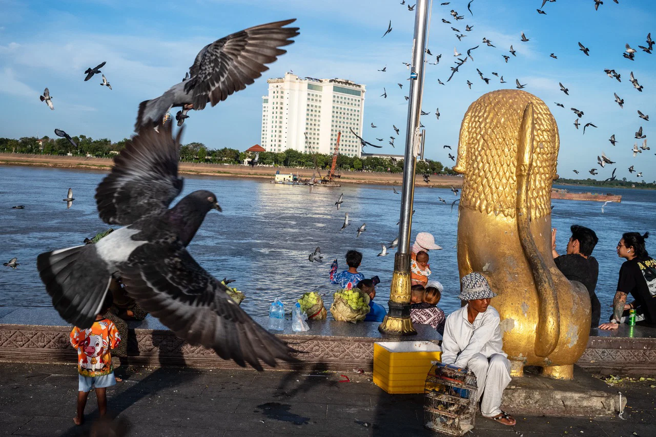 Mo also turns his lens to the spiritual and ritualistic life of the city. A young girl participates in a “mercy release” ceremony, reaching toward a cage of birds set against the backdrop of the Mekong and the Sokha Hotel. Elsewhere, a golden guardian lion — a traditional symbol of protection — stands as a silent witness along the promenade, appearing beside flower sellers, resting children, and blurred passersby, its immobility set against the ceaseless flow of people, pigeons, and river traffic. These photographs balance sacred ritual, everyday gesture, and urban context, illustrating how tradition and modernity coexist along the riverbank.